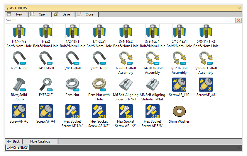 The 0-FASTENERS sub-group is a collection of common fasteners and/or assemblies that have parametric or assembly features assigned to them.