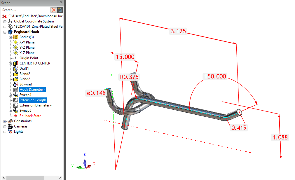 A structed part with direct dimension drivers to modify the hook as desired to match the included webhook specifications from McMaster-Carr.