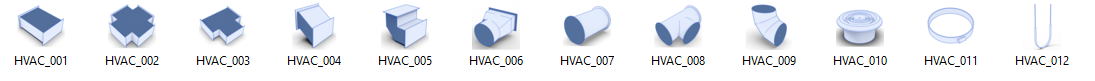 Sub-group with common HVAC ductwork components. This is for conceptual design in its current start and has built-in SmartAssembly paired connections. You can edit the parts as needed to resize to suit.