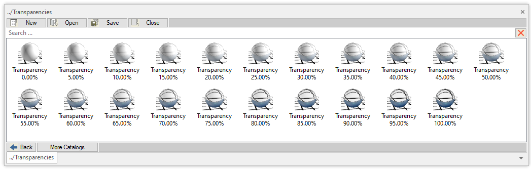 A sub-group of various transparency settings ranging from 0 to 100% in increments of 5%. This is to aid in the design and modeling processes when looking thru a part may be helpful. This approach of dragging the desired transparency is sometimes more productivity then using the "Set as Transparent" tool.
