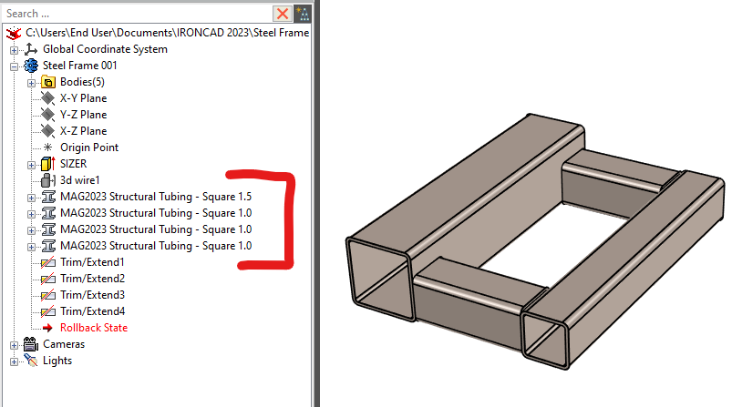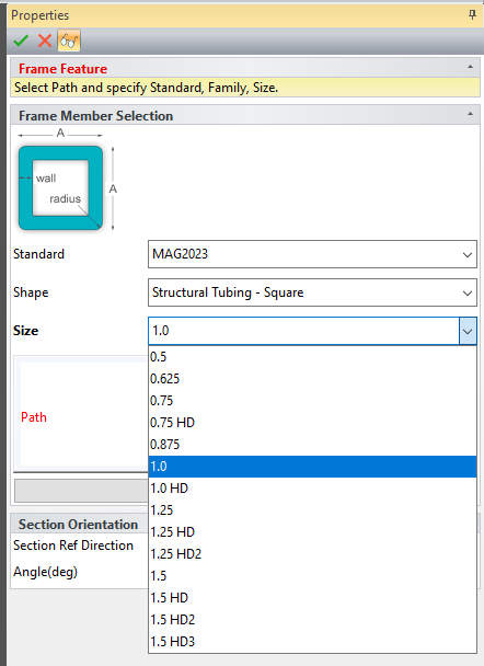 Structured Steel Frame which is set to 1" x 1" Square Tubing by default. This is using the MAG2023 Custom Structured Frame files included in this release. See "MAG2023 Custom Frame" below. MAG2023 Custom Frame We have setup a new custom frame for Structural Tubing-Square with sizes from 1/2 to 1-1/2" Squares. This is used when generated steel structured frames in Structured part mode.