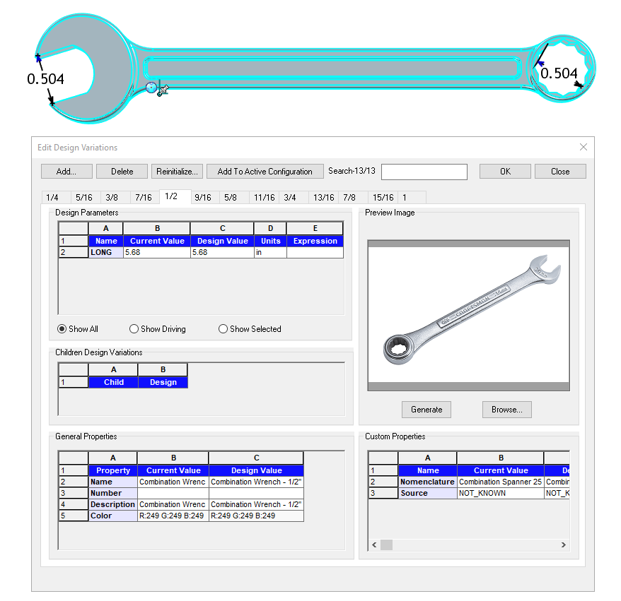 A simple variant model of a combination wrench ranging from 1/4" to 1" size. Part of the "Lean" type components. NOTE: Please note the lengths of these vary from brand to brand, so if that's important, please double check the length according to the brand you desire. You can alter the length in the design variation field or override altogether using Part Properties Sizebox handles.